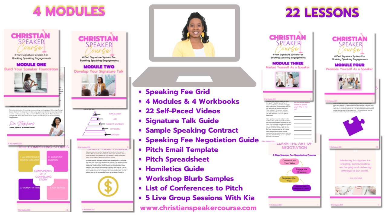 As a speaker who was on hiatus, Kia's Christian Speaker Course was informative and answered my questions about what event hosts are looking for and how to market myself as a speaker after taking a break. If you are beginning your Christian speaking journey, this course will help prepare you to speak professionally. If you have already started your journey, this course will give you a greater understanding of how to navigate the Christian speaking industry.